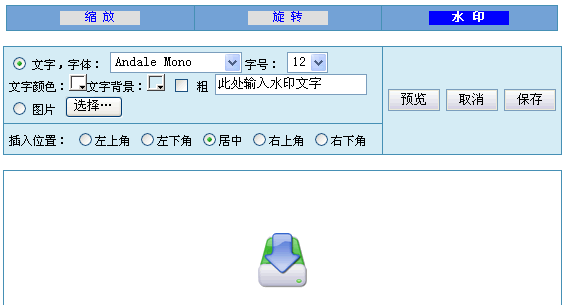 水印提供文字水印及图片水印两种效果,如果想写文字水印,还可以选择字体、字号、文字颜色、文字背景,是否粗体的设置,文字背景可以选择透明色。如果想打图片水印,则要加的水印图片必须是已经上传到此图片的同一目录下,点击“选择”显示所有图片,可以选择: |